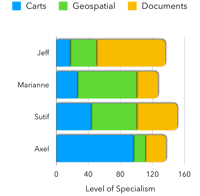 Firstly, let’s be honest. This arrangement doesn’t just happen overnight. It's likely to take years to achieve. Jeff is a specialist in Documents, has some competence in Geospatial, but only a small amount in Carts. Marianne has a high degree of Geospatial skills, and a moderate amount in Documents and Carts. Sutif has general skills in all three domains - very useful indeed. Axel is a specialist in Carts, but much less in the others.