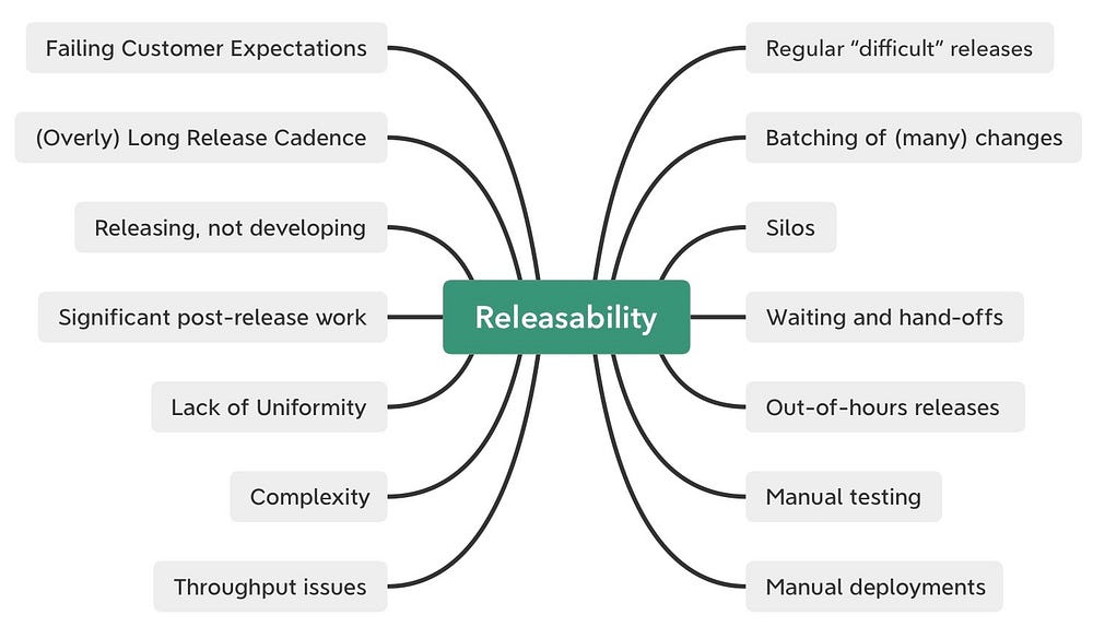 Some common signs of Releasability issues include: the inability to meet customer expectations, regular “difficult” releases, a long Release Cadence, batching, manual work, a lack of Uniformity, and significant complexity.