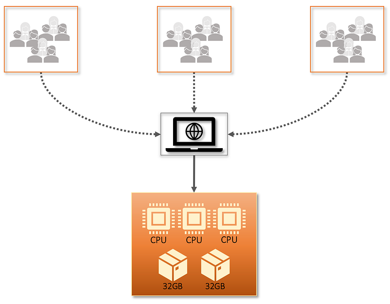 To demonstrate this, let's assume that our software runs in a corporate environment, and we have some control over the number of users. The users interface with a web front end to communicate with APIs deployed on our (single) instance. See below.