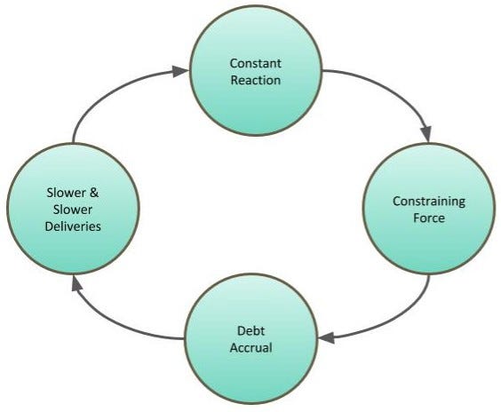 What's occurring is a continuous (vicious) cycle, where the constant need to react causes rushed decisions and constrains our optionality (possible solutions), leading to an increase in debts, slower deliveries, and consequently poorer Sustainability.